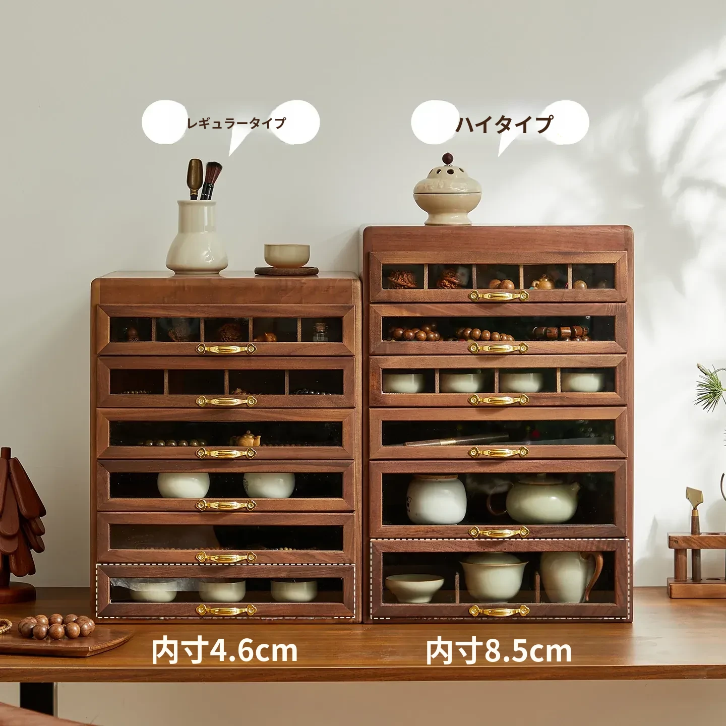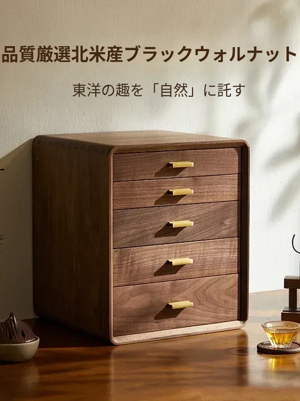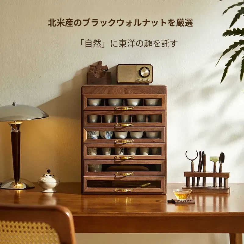 黒胡桃の無垢材製ドロワー歯科キャビネット - テーブル上のティーポットと茶器、文房具や手串、おしゃれなアクセサリーの収納ボックス!大容量でスタイリッシュな収納を実現!
