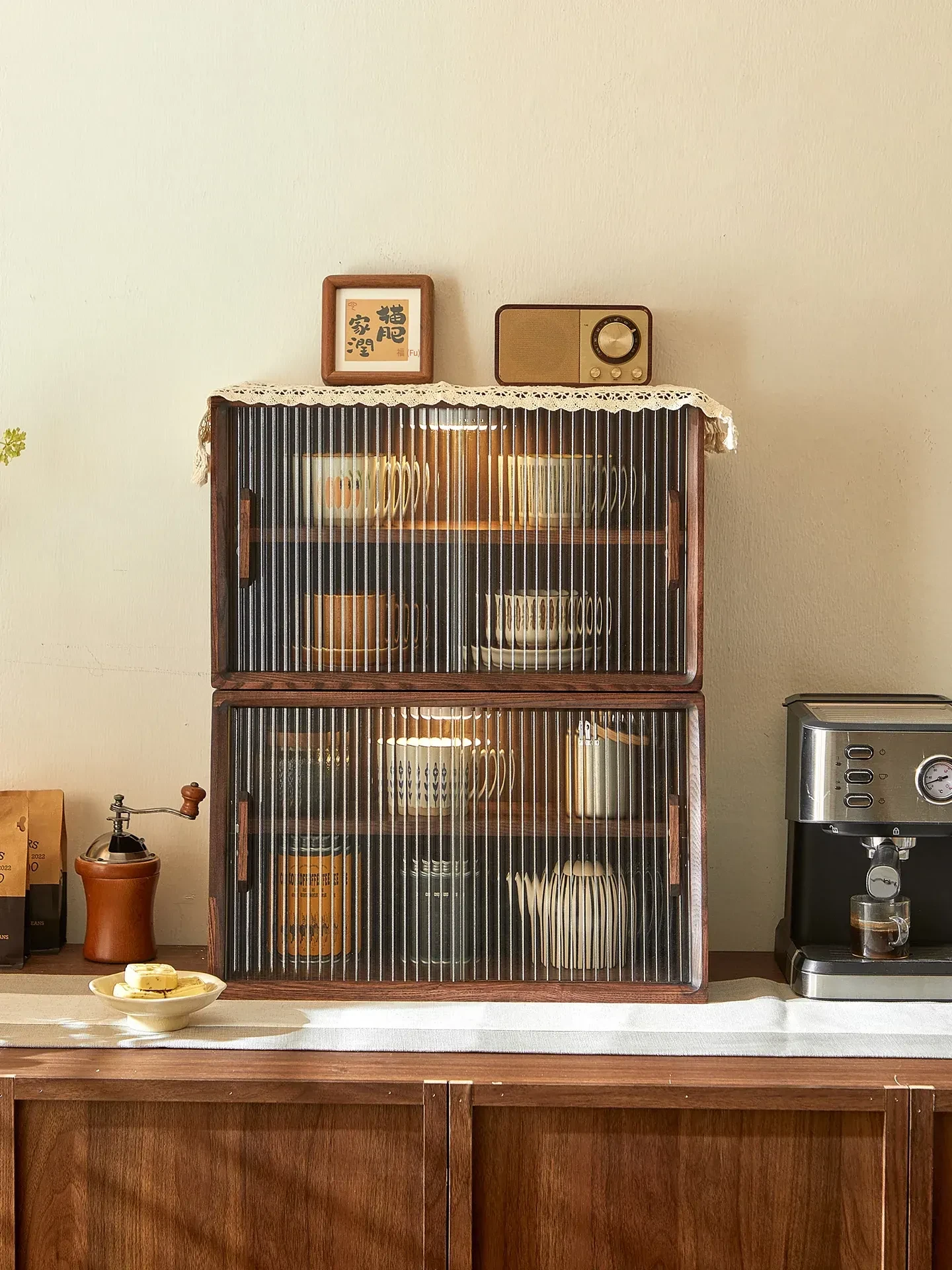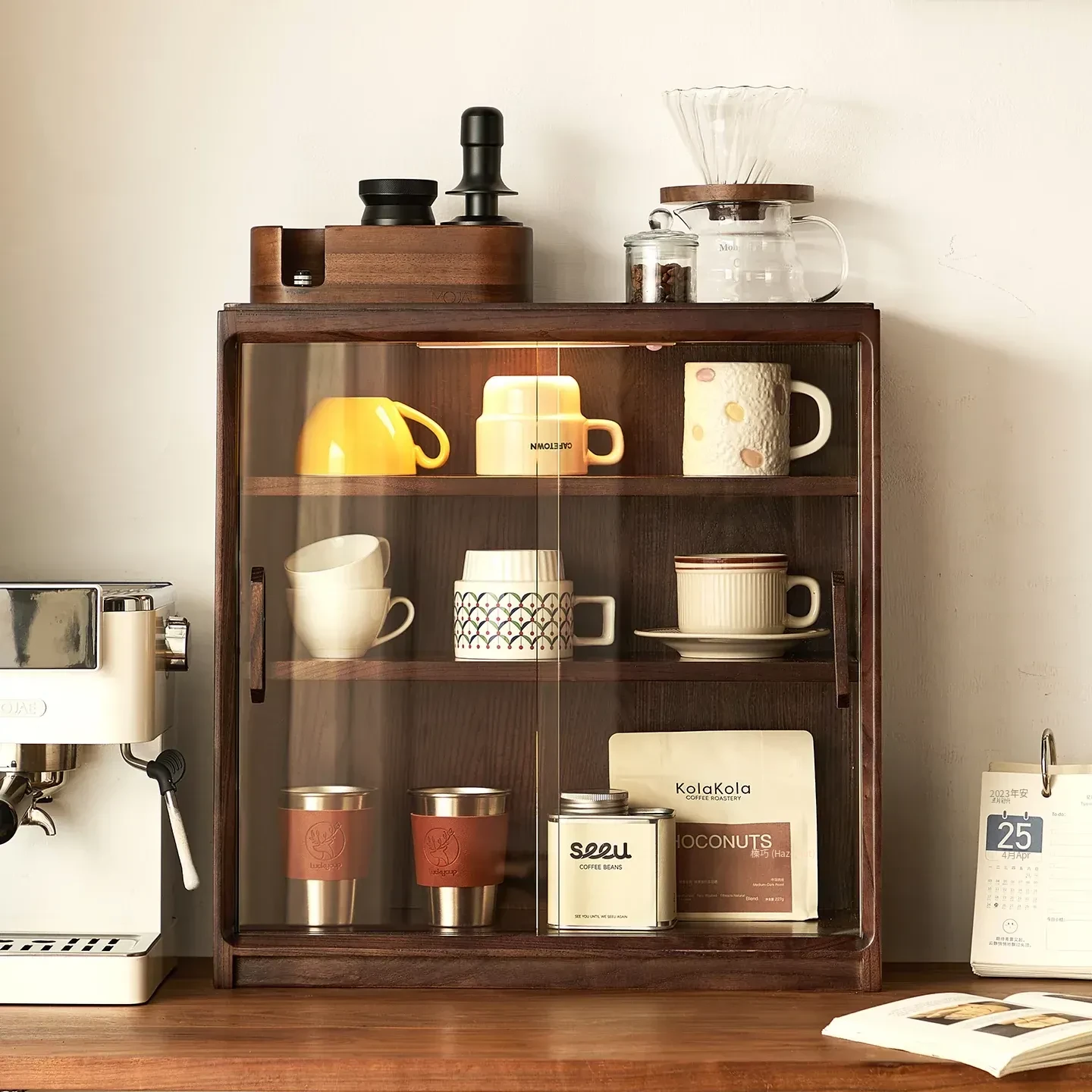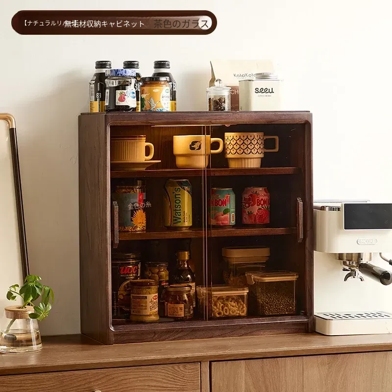 ほこりから守る!実木製収納キャビネット - テーブル上の水杯や茶器、コーヒーを美しく収納できるリビングやダイニングの必需品。スタイリッシュな木製ラックで、すっきりとした空間を実現!