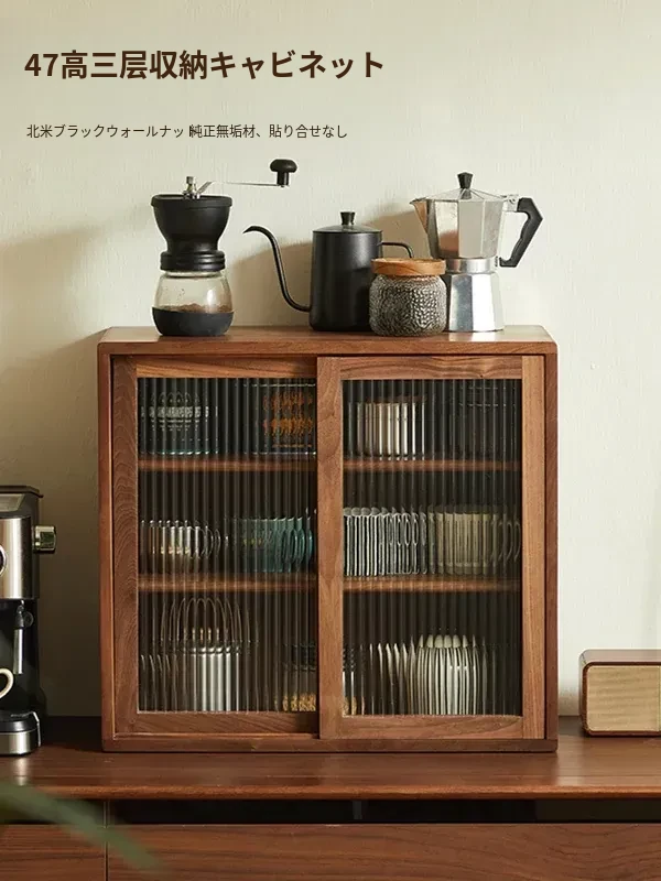 黒胡桃の無垢材を使用したレトロ中式のダイニングサイドキャビネット - 防塵設計で茶器やコーヒーカップもスッキリ収納!おしゃれなインテリアに最適な収納棚です。
